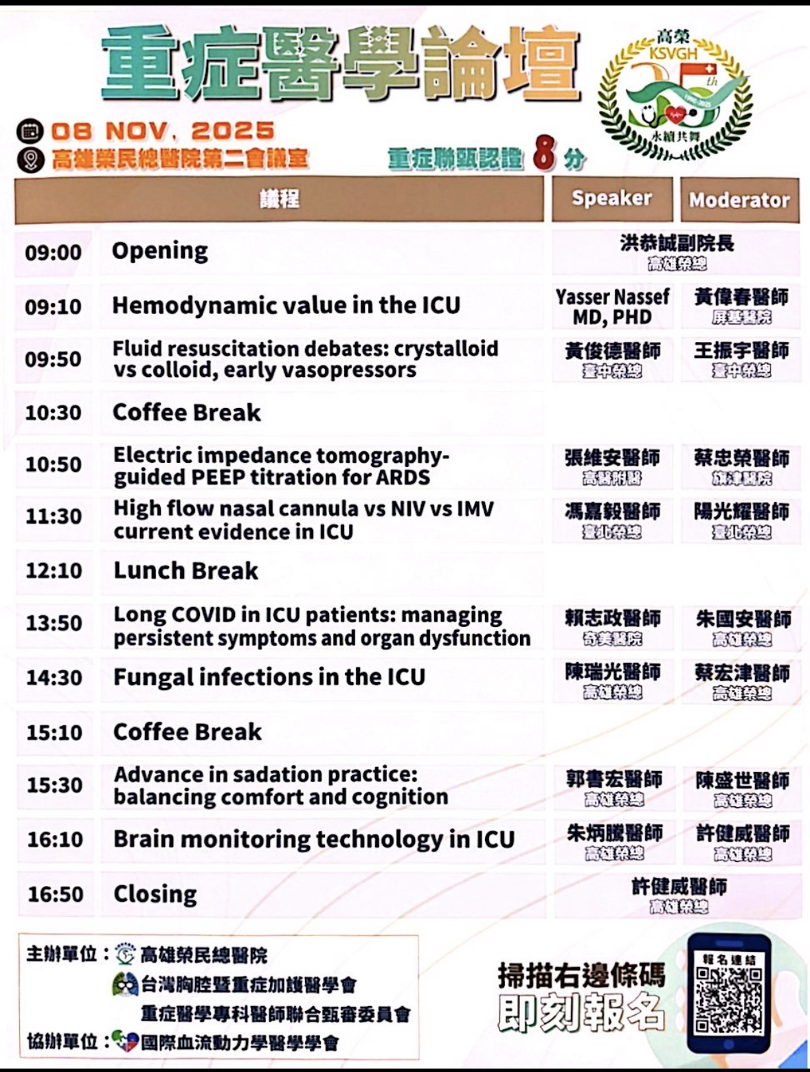我們非常感謝許健威理事的精心規劃,使重症課程得以順利舉辦。同時,也特別感謝 Dr. Yasser 理事帶來精彩的演講。我們期待與 ISH國際血流動力學醫學學會共同努力,持續提升重症治療的品質。